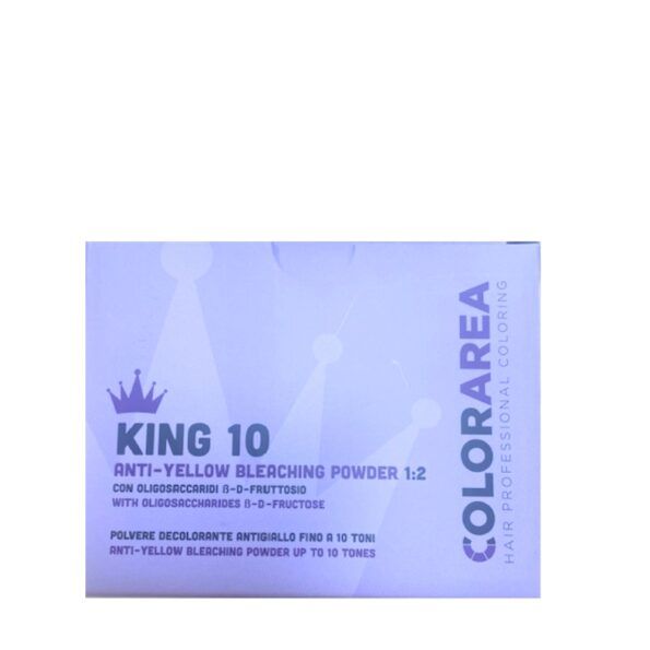 High -quality bleaching powder for 9+1 levels of lift, with neutralising pigments to counteract unwanted red/orange tones and to obtain beautiful shades of natural blonde. This powder subdues unwanted golden tones that normally remain in hair after using normal bleaching powders. KING 10 is a new, universal bleaching powder with ammonia that is ideal for any lightening techniques, full head, foil or cap highlights. This powder is enriched with special pigments thats effectively counteract yellow tone in bleached hair. With this product you can obtain a beautiful shade of natural blonde without using the toner. Excellent hair conditions after bleaching and neutralisation of yellow-orange tones with any bleaching technique! No dust-no infate formula.